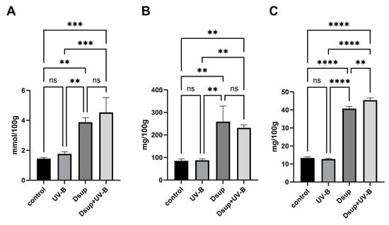 Antioxidant, polyphenol, and flavonoid content of control pollen tubes, UV-B-stressed pollen tubes, and Dsup-expressing pollen tubes. (A) FRAP assay for antioxidant content; (B) Folin-Ciocalteau test for polyphenol content; and (C) aluminum chloride test for flavonoid content. Control: untreated pollen tubes. UV-B: UV-B-stressed pollen tubes after 5 h of growth. Dsup: pollen tubes that express the Dsup gene but have not been exposed to UV-B radiation. Dsup + UV-B: Dsup-expressing pollen tubes exposed to UV-B after 5 h of growth (** p < 0.01; *** p < 0.001; **** p < 0.0001; ns: not significant).