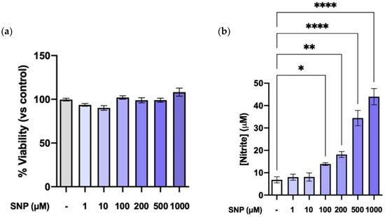 Effect of increasing concentrations of SNP in cell viability and NO production. (a) Cell viability of bEnd.3 cells exposed to increasing SNP concentrations determined by the MTT assay. (b) NO production by bEnd.3 cells after treatment with increasing concentrations of SNP measured using the Griess assay. Results are given as mean ± SEM; n = 6 technical replicates. All the experiments were repeated at least four times. * p < 0.05, ** p < 0.01, and **** p < 0.0001, as indicated in the graph.
