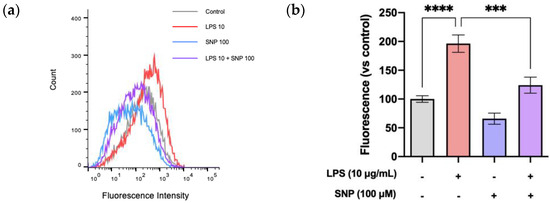 Intracellular ROS production was measured using flow cytometry with CM-H2DCFDA. As seen in Figure 3, LPS increased ROS levels in a significant manner when compared to control cells. SNP treatment significantly reduced LPS-induced ROS generation. Also, 24 h treatment with SNP significantly increased NO levels in bEnd.3 cells in the presence or absence of LPS, which has no effect on its own (Figure 4).