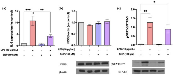 To elucidate the signaling pathway that SNP triggers to exert this anti-inflammatory effect, a Western blot analysis of several proteins related to various pro-inflammatory pathways was performed. As showcased in Figure 5b, iNOS protein levels were not affected by treatment with LPS or SNP. On the other hand, a 24 h exposure to LPS induces a significant increase in STAT3 phosphorylation, an effect that SNP tends to decrease, although not significantly (Figure 5c).