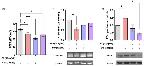 The potential protective effects that SNP has on LPS-challenged barrier integrity were assessed. As shown in Figure 6a, 24 h exposure to LPS significantly reduced bEnd.3 monolayer TEER. Additionally, treatment with SNP, whether alone or in the presence of LPS, resulted in a significant reduction in TEER.