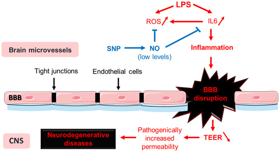 Inflammation is associated with BBB disruption in neurodegenerative diseases, making it a potential therapeutic target. NO is a crucial regulator of vascular function, but its effects are context-dependent, and the level of NO formation determines whether it has beneficial or deleterious effects. In our experimental model, LPS treatment led to an increase in ROS production and an inflammatory response, including activation of the JAK2/STAT3 pathway and the expression of pro-inflammatory markers like IL-6. SNP, an NO donor, reduces ROS production and IL-6 levels, potentially mitigating the inflammatory response (Figure 9). However, it does not prevent BBB disruption induced by LPS, leading to decreased TEER and altered expression of TJ proteins like claudin-5 and ZO-1. Also, the concentration of SNP used in this study did not significantly alter the adhesion of Raw 264.7 cells to bEnd.3 cells but showed a trend towards an increase. Our findings suggest that while SNP demonstrates some anti-inflammatory effects, these effects may not completely translate into direct protection of the BBB in our experimental conditions. Therefore, the potential use of SNP in neurodegenerative diseases, while not entirely ruled out, should undergo further in-depth investigation.