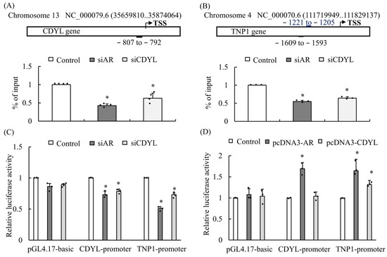 To explore the mechanism of AR signaling on downstream targeted genes involved in spermatogenesis, we applied the ALGGEN-PROMO virtual lab to predict putative AR response elements (AREs) in the CDYL and TNP1 promoter regions (Figure 3A,B). To determine whether AR binds to the targeted gene promoter regions, TM4 cells were knocked down for AR or CDYL expression, followed by chromatin immunoprecipitation (ChIP) assays (Figure 3A,B). The results showed that insufficient expression of AR significantly decreased AR binding to ARE in the CDYL and TNP1 promoter regions, and similar data for CDYL were obtained (Figure 3A,B). Next, CDYL or TNP1 upstream regions starting at position −3000 were cloned into the pGL3-Basic plasmid before the luciferase reporter gene. The siRNA-mediated knockdown of AR or CDYL expression substantially decreased CDYL or TNP1 promoter activity in TM4 cells, as shown by dual-luciferase assays. Downregulating AR or CDYL also decreased CDYL and TNP1 promoter activity (Figure 3C). In contrast, the overexpression of AR or CDYL increased the CDYL and TNP1 promoter activity (Figure 3D).