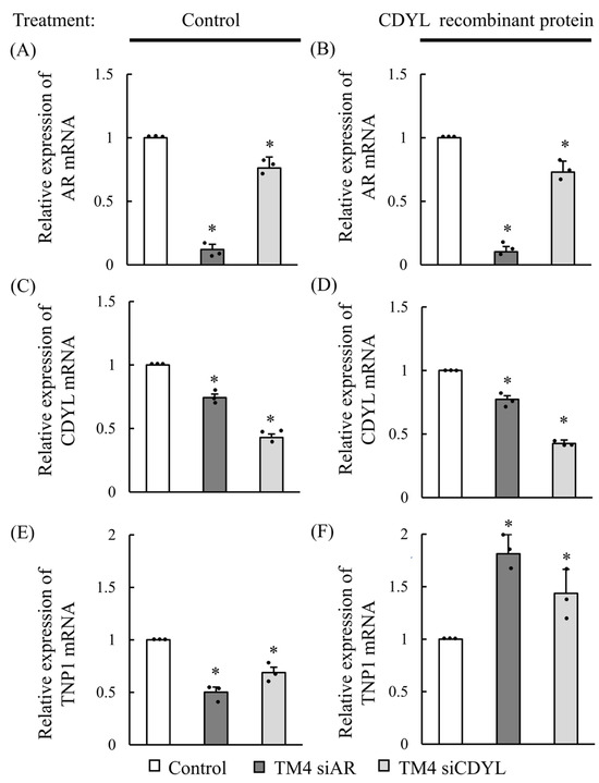 mRNA expression of AR, CDYL, and TNP1 association by CDYL rescue in Sertoli cells. mRNA expression of AR, CDYL, and TNP1 association among control, AR siRNA-treated, and CDYL siRNA-treated groups in TM4 cells by non-treat and CDYL rescue. mRNA expression of AR (A,B), CDYL (C,D), or TNP1 (E,F) were detected after being transiently transfected with control, AR, or CDYL siRNA-treated (A,C,E). Moreover, these three groups were treated with 200 ng CDYL recombinant protein (B,D,F) for 24 h in TM4 cells. * p ˂ 0.05 for one-way ANOVA was significant compared with the control. (n ≥ 3) in each group, and error bars represent ± SD.