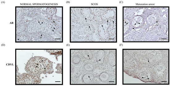 We examined the expression of AR and CDYL in normal and pathological human testes (Sertoli cell-only syndrome and maturation arrest) by immunochemistry (Figure 5). As shown in Figure 5A,D, both AR and CDYL proteins were detected in normal human testes (Figure 5A,D). While the AR protein was expressed, the CDYL protein expression was negligible in the testes of patients with Sertoli cell-only syndrome (Figure 5B,E). Similar results were obtained, showing that a low level of CDYL protein was expressed in human testes with maturation arrest (Figure 5C,F). These results demonstrate that CDYL expression is correlated with normal human spermatogenesis and is deficient in patients with maturation arrest.