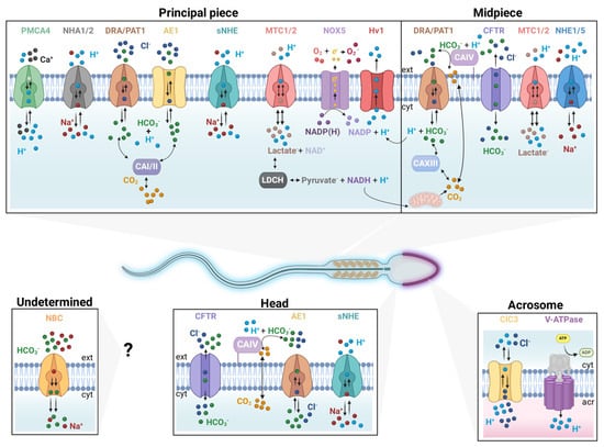 The proton (H+), a hydrogen atom stripped of its electron, is the smallest cation in the universe and one of the most controlled ions in the cytosol and in intracellular compartments. Its cologarithm, the pH, is challenging to regulate because: (1) H+ are rapidly released or consumed as acid-base equivalents in many reactions; (2) cells generate and control H+ gradients to store and transform free energy and to signal; (3) the availability of H+, thus pH, determines the surface charge of molecules, their physicochemical properties, and how they interact with each other []. Cellular processes operate within a narrow pH range, so precise regulation of pH is essential for cell function. As cells are compartmentalized, enzyme activity, gene expression, membrane channel operation, and transport are influenced by the pH of the cell compartment where the corresponding proteins are localized. The external pH (pHe) to which cells are exposed can vary and alter the cytosolic and intraorganellar pH []. Although mammalian sperm possess the nucleus, the redundant nuclear envelope (which contains residual nuclear material), and mitochondria as essential organelles, this review mainly focused on the regulation of the cytosolic pH (pHi) and the intra-acrosomal pH (pHa). Cell metabolic activity influences both pHi and pHa. Cells employ a set of proteins and transporters that move or transform acids and/or bases to finely regulate the pH in all compartments, since failure to do so has severe functional consequences. H+, HCO3−, and CO2 are stellar elements of pH regulation that are used not only to ensure proper cell function but also to participate in key signaling events necessary for organellar and cell-cell communication [,].
