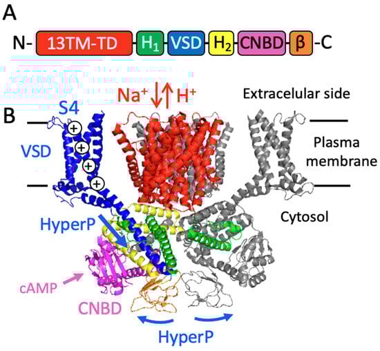 Structure of the sperm-specific Na+/H+ exchanger, sNHE (SLC9C). (A) depicts the domain arrangement of sNHE with color-coded features representing different domains: transporter domain composed of 13 TMs (13TM-TD, red), first cytosolic helices (H1, green), voltage sensor domain (VSD, blue), second cytosolic helices (H2, yellow), cyclic nucleotide-binding domain (CNBD, pink), and the C-terminal β strand domain (β, orange). (B) illustrates the 3D structure of an inactive state of sea urchin sNHE (SpsNHE) dimer, determined by cryo-EM analysis (PDB ID: 8OTX, []). To highlight the interphase of the dimer in the cytosolic helix domain, one monomer is colored according to Scheme A, while the other monomer is represented in gray using the PyMOL program. Hyperpolarization (HyperP) of the membrane potential is expected to induce a downward movement of the positively charged S4 segment of the VSD, rendering the sNHE in an active state. Additionally, the binding of cAMP to the CNBD might facilitate the conformational change toward the active state.
