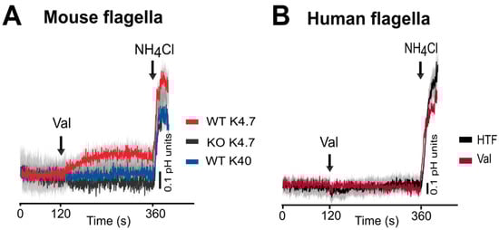 pHi changes in response to a valinomycin-induced hyperpolarization in mouse and human sperm. Sperm pHi was assessed using the pH-sensitive dual-emission fluorescence probe, SNARF-5F (Excitation= 530 nm; Emission= 575/640 nm) in single cell recordings. Panel (A) illustrates pHi changes in the midpiece of mouse sperm induced by 1 µM valinomycin (Val) followed by a 20 mM NH4Cl control addition. WTK4.7 (red trace) represents wild-type mouse sperm in a normal medium containing 4.7 mM K+, while KOK4.7 (black trace) indicates sperm from sNHE (SLC9C1) null mice in a normal medium. WTK40 (blue trace) indicates wild-type sperm in a medium with 40 mM K+. Panel (B) depicts pHi changes in the human sperm flagellar midpiece. HTF (black trace) indicates the addition of medium, serving as a negative control against the addition of 1 µM valinomycin (Val, red trace). The results are adapted from [], with some modifications.