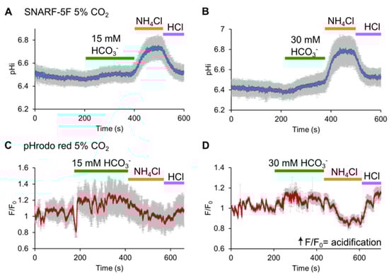 Indicator-dependent pHi changes in response to HCO3− perfusion in human sperm. HCO3− causes a pHi alkalinization in human sperm, as reported by the SNARF-5F dye, but a slight pHi acidification when pHrodo red is used. Representative pHi recordings using SNARF-5F (A,B) and pHrodo red (C,D) perfusing 15 or 30 mM HCO3− (green rectangle) in a 5% CO2 environment. As positive controls, perfusions of 10 mM NH4Cl (orange rectangle) and 5 mM HCl (purple rectangle) are shown in each panel. Traces in each panel show average responses from 104 cells (for SNARF-5F) and 101 cells (for pHrodo red), with S.E.M. in gray. Ratiometric SNARF-5F measurements are reported as pHi values, whereas for pHrodo red, the F/F0 normalization is shown, and F = fluorescence intensity. ↑F/F0 indicates pHi acidification.