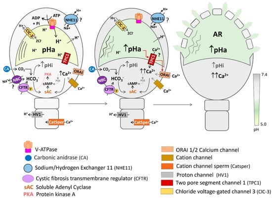 The acrosome becomes alkalinized during mammalian sperm capacitation in a manner dependent on the presence of HCO3− and Ca2+ in the external medium. The regulation of the V-ATPase and how it is influenced by the associated ACs-PKA signaling pathway is yet to be established. The impact of pHa on sperm physiology is only beginning to be understood. It is proposed that the pHa increase is a key step in initiating AR. The specific ion transporters and proteins responsible for pHa regulation are not fully characterized, and their relative contribution to acrosome alkalinization in triggering this reaction under physiological conditions needs further elucidation. It is also relevant to know what other transporters and/or channels are present in the acrosome that can directly or indirectly modulate pHa and determine its physiological influence on fertility.