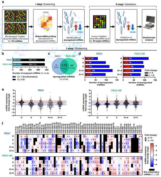 To establish the miRNA expression profile associated with acquired resistance to olaparib and understand the effects of combined treatments on miRNAs in HGSOC cell lines, we performed a large-scale miRNA differential expression analysis using a two-step approach (Figure 1a). A screening of 754 miRNAs was performed in PEO1 olaparib-sensitive and previously established PEO1-OR olaparib-resistant cells [] using pre-designed TaqMan™ Array MicroRNA Cards. Based on the screening results, custom TaqMan™ Array MicroRNA Cards were designed and used for further validation of selected miRNAs in all OC cell lines.