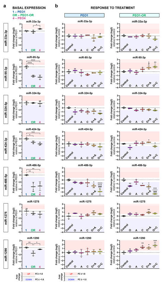 Differential expression analysis for miRNAs dysregulated in PEO1-OR cell line at basal levels (in the absence of inhibitors) and after treatments with tested combinations. (a) Basal miRNA expression in untreated PEO1-OR cells compared to PEO1 cells. (b) miRNA expression in PEO1-OR cells treated with olaparib (O), ATRi (A), CHK1i (C), or their combinations for 2 days. Levels of miRNA were determined via real-time qPCR and expressed as means of logarithmic fold change ± SD (n = 3–4). Statistical significance was assessed with ordinary one-way ANOVA followed by multiple comparison tests: * p < 0.05, ** p < 0.01, *** p < 0.001, **** p < 0.0001 (treatment vs. control); + p < 0.05, ++ p < 0.01, +++ p < 0.001, ++++ p < 0.0001 (O vs. combination with A or C); # p < 0.05, ### p < 0.001 (A or C vs. respective combinations with O). The red and blue areas indicate FC values for upregulated and downregulated miRNAs (absolute log2 of fold change ≥ 0.585), respectively.