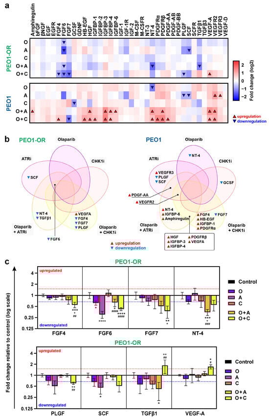 Olaparib combined with ATRi or CHK1i dysregulates the expression of growth factors (GFs) in OC cell lines. (a) Heatmaps for the expression of 41 GFs and their receptors in PEO1 and PEO1-OR cell lines. (b) Venn diagram for dysregulated GFs in PEO1 and PEO1-OR cell lines. (c) Results of semi-quantitative analysis with antibody microarrays for significantly dysregulated GFs in PEO1-OR cells (absolute fold change ≥ 1.5 and p < 0.05). Cells were incubated with inhibitors (O, A, C) or their combinations (O + A, O + C) for 2 days. Data are expressed as mean fold change ± SD (n = 4) on a logarithmized scale relative to untreated control cells. Statistical significance was assessed using ordinary one-way ANOVA followed by multiple comparison tests: * p < 0.05, ** p < 0.01, *** p < 0.001, **** p < 0.0001 (treatment vs. control); + p < 0.05, ++ p < 0.01 (O vs. combination with A or C); # p < 0.05, ## p < 0.01, ### p < 0.001, #### p < 0.0001 (A or C vs. respective combinations with O).