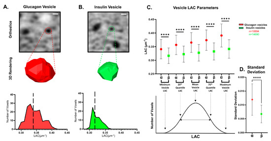 Along with structural differences, we observed a significant difference in the mean LAC values for both vesicle types. A significantly higher mean LAC value of 0.365 ± 0.04 μm−1 was observed for glucagon vesicles compared with 0.328 ± 0.03 μm−1 for insulin vesicles (Figure 2C), indicating a significantly higher molecular density for glucagon vesicles. This is in line with EM observations on glucagon granules appearing consistently denser than insulin granules [11,12,40] (Figure S3).