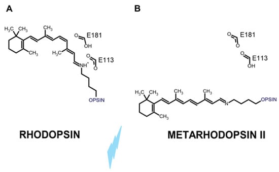 (A) In ciliary photoreceptors expressing c-type opsin with bound 11cis-RAL, the negative charge provided by E113 stabilizes the positive charge of the protonated Schiff base. (B) Light (cyan) isomerizes 11cis-RAL to at-RAL. After several quick rearrangements, E133 may not stabilize the metarhodopsin II deprotonated Schiff base, which became protonated, preventing at-RAL photoreversal to 11cis isomers.