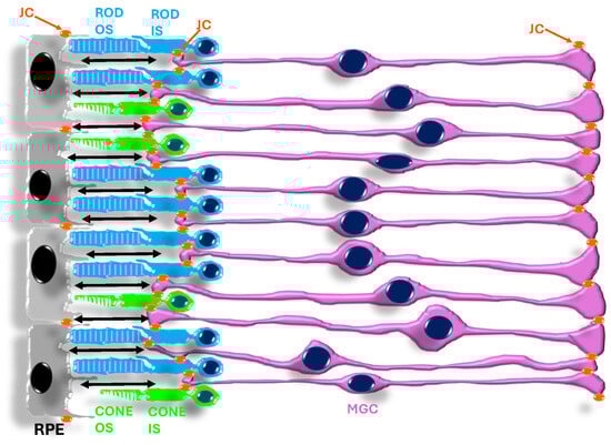 Outer (OS) and inner (IS) segments of cone (green) and rod (cyan) cells lie in the subretinal space (double-arrow line), which is limited by the junctional complexes (orange) of the retinal pigment epithelium (RPE) and those of the outer limiting membrane (OLM) between Müller glial cells (MGCs) (pink) and rod and cone IS.