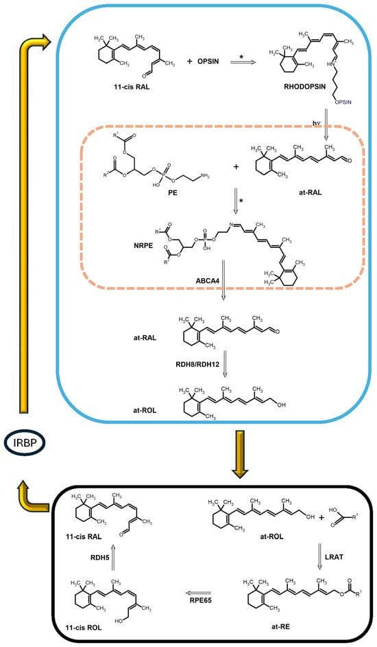 The cyan box shows chemical events in the OS. Opsin and 11cis-RAL react, forming a protonated Schiff base between a lysin amino group of the opsin and the aldehyde. After light-induced (hv) 11cis-RAL isomerization, at-RAL is released inside the disk (orange dotted box). It reacts spontaneously with the phosphatidyl ethanolamine (PE) amino group, generating N-retinylidene ethanolamine (NRPE). NRPE is transferred to the OS cytoplasm by the flippase ABCA4. at-RAL dissociates from PE in the cytoplasm and is reduced to all-trans retinol (at-ROL or vitamin A) by retinol dehydrogenase 8 and 12 (RDH8 and RDH12). In the RPE (black box), retinol generated and released by the OS, is esterified by lecithin retinol acyl transferase (LRAT) into at-RE. RPE65 exhibits isomerohydrolase activity, converting at-RE into 11cis-ROL. Retinol dehydrogenase 5 (RDH5) converts 11cis-ROL into 11cis-RAL, which may be bound by cellular retinaldehyde-binding protein (CRALBP) (not displayed in the Figure) to prevent spontaneous isomerization. CRALBP eventually transfers 11cis-RAL to the interphotoreceptor-binding protein (IRBP), which conveys it to the OS by diffusion across the subretinal space (yellow arrows). * indicates a spontaneous reaction between amino groups and an aldehyde group.