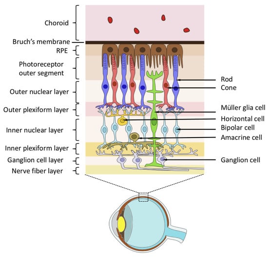 - Cepko, C. Intrinsically different retinal progenitor cells produce specific types of progeny. Nat. Rev. Neurosci. 2014, 15, 615–627. [Google Scholar] [CrossRef]