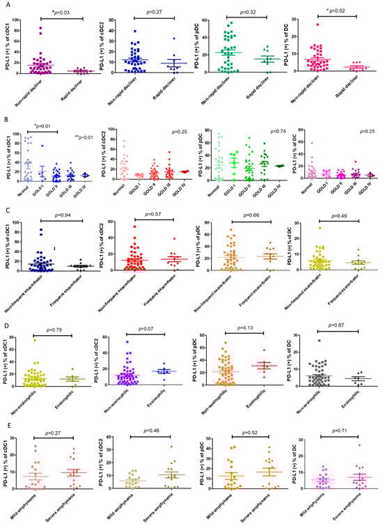 Next, we asked whether the decrease in PD-L1+ cDC1 was linked to any clinical characteristics, particularly the distinct phenotypes of COPD. We found that the proportion of PD-L1+ cDC1 was significantly lower in the patients with COPD with rapid lung function decline compared with those without a rapid decline in lung function (4.6 ± 4.7% vs. 15.5 ± 18.6%, respectively; p = 0.02, Figure 2A). This association was specific to the subtype cDC1, which was selectively decreased in PD-L1 in this subtype of DC (Figure 1A). The PD-L1 expressions by DCs were compared among the patients with COPD at different GOLD stages and the normal subjects. The results showed that a statistically significant reduction in the number of PD-L1+ cDC1 cells was only seen in the patients with GOLD stage II COPD and not in the normal subjects (10.6 ± 10.8% vs. 32.5 ± 33.1%, respectively, p = 0.01, Figure 2B). These observations were in line with previous studies on the trajectory of lung function, showing the fastest decline in lung function at the same stage of the disease []. There was no significant difference in the expression levels of total PD-L1 among the three subtypes of DCs in the phenotypes examined, including frequent exacerbators, eosinophilic, and emphysema (Figure 2C–E). Thus, PD-L1 expression by cDC1 is distinctively associated with the rapid decline in lung function.