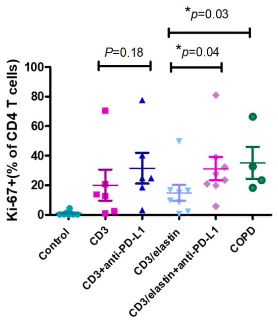 PD-L1 is involved in inhibiting CD4 T cell proliferation. Representative proliferation marker (Ki67) for CD4+ cells from normal subjects (n = 6–8) and patients with COPD (n = 4) with and without anti-PD-L1 blocking antibodies after in vitro stimulation with anti-CD3 and anti-CD3/elastin peptides (30 ng/mL). Mann–Whitney U test was used to compare the data of the two groups under the stimulated condition. * p < 0.05.