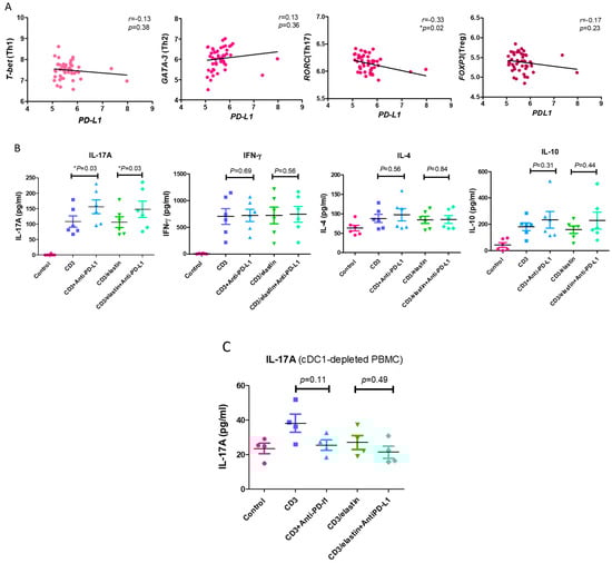 PD-L1 is involved in inhibiting the differentiation of Th17 cells. (A) The expression levels of T-bet (represented as Th1), GATA-3 (represented as Th2), RORC (represented as Th17), and FOXP3 (represented as Treg) genes in the whole blood of 49 COPD patients (GSE56766 dataset) were correlated with the expression of PD-L1. (B) The Th1 (interferon-gamma, IFN-gamma), Th2 (interleukin 4, IL-4), Th17 (interleukin 17A, IL-17A), and Treg cytokine (interleukin 10, IL-10) levels in the CD4+ subset cells from 6 normal participants stimulated with a CD3 or CD3/elastin peptide alone or with an anti-PD-L1 blocking antibody were compared with those of the vehicle controls. These cytokine levels produced by the CD4+ subset cells in the normal participants were measured using ELISA. (C) The comparison of Th17 cytokines (interleukin 17A, IL-17A) between the normal subjects stimulated with a CD3 or CD3/elastin peptide alone or with an anti-PD-L1 blocking antibody (n = 4) from the cDC1-depleted PBMCs. Mann–Whitney U test was used to compare the data of the two groups under the stimulated condition. * p < 0.05.