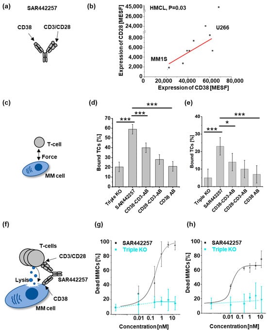 Characterization of SAR442257 potency in human multiple myeloma cell lines (HMCLs): (a) SAR442257 geometry; (b) correlation of target expression (in molecules of equivalent soluble fluorochrome (MESF)) of CD38 and CD28 on 10 HMCL. We measured CD38 and CD28 target expression and found a linear relationship with Pearson’s r = 0.7, p = 0.03. (c–e) Cellular avidity ranks as a percentage of TCs bound to MM cells by indicated TC engagers (triple knockout (KO), SAR442257, CD38-CD3-antibody (AB), CD28-CD3-AB, CD38 AB) for U266 (d) and MM1S (e). (f–h) Dose response curves of SAR442257 or triple KO control in (g) U266 and (h) MM1S with healthy donor TCs (E:T = 10:1). (Significance was determined using TTEST, * p < 0.05, *** p < 0.001).