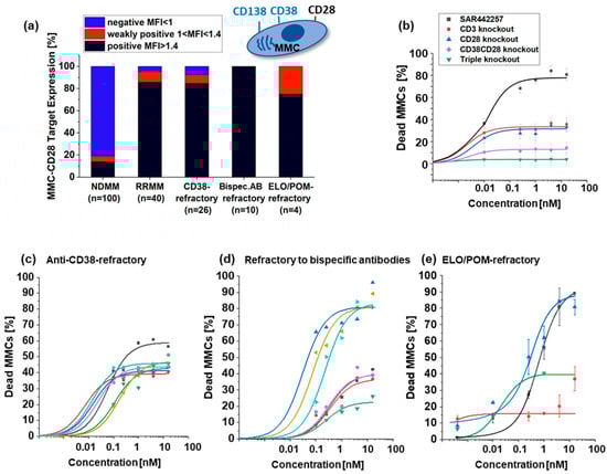 (a) Percentage of CD28 positive NDMM (n = 100) and the mean values of CD28 positive RRMM (n = 40), anti-CD38-refractory (n = 26), bispecific antibodies for TC engagement-refractory (n = 10), and ELO/POM-refractory (n = 4) patients (black bar indicates CD28 positive target expression, red bar weakly positive and blue bar CD28 negative target expression). (b) Mean value of dose-response curves of indicated TC engagers for 40 investigated samples from refractory MM patients. We show the percentage of dead MMCs after contact to SAR442257 (black), CD3 knockout antibody (red), CD28 knockout (blue) CD38CD28 knockout (violet) and triple knockout (green). (c–e) Dose response curves for patients with different pretreatment (c) anti-CD38 antibody refractory, (d) refractory to bispecific antibodies for TC engagement, and (e) ELO/POM refractory patients. Each patient is represented in a different color.