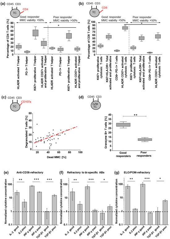 To assess differences in TC activation between responder groups, we analyzed CD4 and CD8-positive TCs for cellular proliferation, degranulation, and the release of cytokines after 24 h at 1 nM SAR442257 for good and poor responders. Significant differences between both groups were observed for CD4-positive activated and proliferative T helper cells and CD8-positive total activated cytotoxic TCs (Figure 3a,b). This effect is more pronounced in samples refractory to bispecific antibodies for TC engagement compared to anti-CD38-refractory RRMM patients (Figure S4). For all patients included in the study, we observed an induction of MM cell lysis by SAR442257 in correlation to TC degranulation (Pearson’s r = 0.7, Figure 3c). Next, we characterized Granzyme B-positive TCs. Good responders had 2.5-fold more Granzyme B-positive TC (Figure 3d). For cytokine release, we assessed the release of IL-2, INF-γ, and TGF-β1 (Figure 3e–g). IL2 and INF-y concentrations in supernatants after exposure to SAR442257 at 1 nM for 4 days were significantly higher in the good responders of all three patient cohorts. This indicates a higher TC activation in good responders, along with enhanced frequencies of cytotoxic and Granzyme B-positive TCs. In contrast, TGF-β levels were significantly higher for poor response in all patient cohorts and most pronounced in daratumumab-refractory patients.