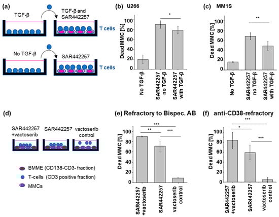Presence of TGF-β in co-culture reduces TCE efficiency. (a) Sketch of the experimental setup (b,c) After a 24-hour culture in TGF-β-supplemented medium, healthy donor TCs are subsequently introduced into a co-culture with (b) U266 and (c) MM1S. TGF-β significantly reduced the drug potency of SAR442257. (d–f) Primary T cells were isolated from patient samples, and MM cells (MMCs) were co-cultured in the presence of the natural bone marrow microenvironment (BMME, CD138-CD3 fraction). Vactoserib, SAR442257, or a combination of vactoserib and SAR442257 were then added to the co-culture system. Vactoserib-SAR442257 combinations overcome TGF-β-induced T cell exhaustion. SAR442257 induced significantly higher MM cell killing in the presence of vactoserib in (e) bispecific antibodies for TC engagement and (f) anti-CD38-refractory samples. Viability was measured after 24 h of co-culture using FACS. All measurements were carried out in duplicates (significance was determined using TTEST, * p < 0.05, ** p < 0.01, *** p < 0.001).