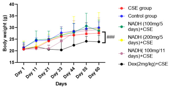 NADH effects on mice body weights. Mice were weighed every 11 days; ### p < 0.001 compared with CSE group (n = 8/per group).