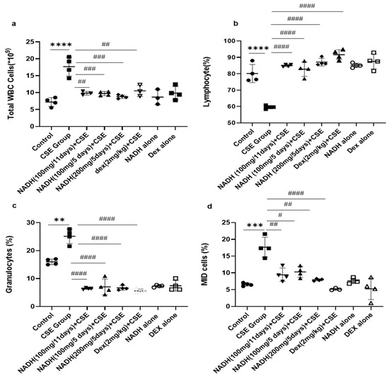NADH, irrespective to the dose and treatment regimen, prevented blood inflammatory changes in mice exposed to CSE. Blood was collected at the end of the experiment from the control groups (diluent, dexamethasone alone, and NADH alone) and the groups treated with CSE alone or with NADH in a5-day or 11-day regimen. The numbers of total white blood cells (a), lymphocytes (b), granulocytes (neutrophils, eosinophils, or basophils) (c), and MID (monocyte and all non-granulocyte or lymphocyte blood cells) (d) were then determined as described in the Section 2. ** p < 0.05, *** p < 0.001, and **** p < 0.0001 compared with the control group; # p < 0.05, ## p < 0.01, ### p < 0.001, and #### p < 0.0001 compared with CSE group (n = 4/per group).