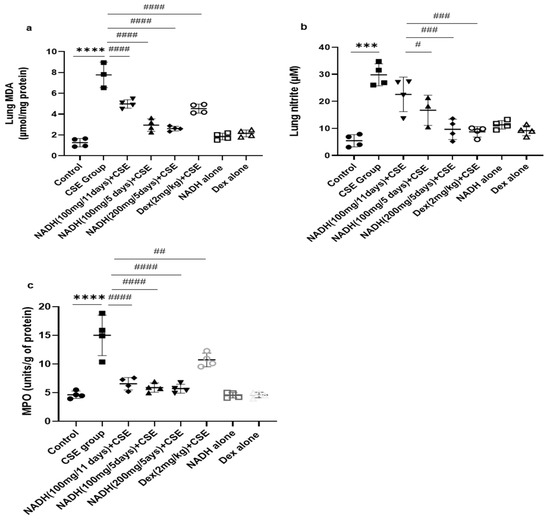 NADH reduced markers of oxidative stress in the lungs of mice exposed to CSE. The levels of malondialdehyde (MDA) (a), nitrites (b), and MPO (c) were assessed as described in the Section 2 in lung homogenates from the control groups (diluent, dexamethasone alone, and NADH alone) or the groups treated with CSE alone or with NADH every 5 or 11 days. *** p < 0.001 and **** p < 0.0001 versus the control group; # p < 0.05, ## p < 0.01, ### p < 0.001, and #### p < 0.0001 compared with the CSE group (n = 4 animals/condition).