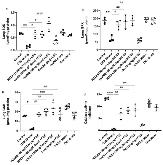 NADH prevented the reduced antioxidant response in the lungs of mice exposed to CSE. The activities of key detoxifying enzymes, including superoxide dismutase (SOD) (a), glutathione peroxidase (GPX) (b), glutathione (GSH) (c), and catalase (d), were assessed in lung homogenates from the control groups (diluent, dexamethasone alone, and NADH alone) or the groups treated with CSE alone or with NADH in the 5-day or 11-day regimen as described in the Section 2. * p < 0.05, ** p < 0.01 and *** p < 0.001 compared with the control group; # p < 0.05, ## p < 0.01, ### p < 0.001 and #### p < 0.0001 compared with the CSE group (n = 4/per group).