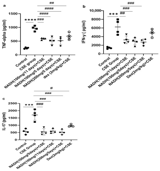 The effects of NADH on levels of TNF-alpha, IFN-γ, and IL-17 in the lungs of mice exposed to CSE. The levels of cytokines, including TNF-alpha (a), IFN-γ (b), and IL-17 (c), were assessed in lung homogenates from the control group or the groups treated with CSE alone or with NADH in the 5-day or 11-day regimen as described in the Section 2. *** p < 0.001 and **** p < 0.0001 compared with the control group; # p < 0.05 ## p < 0.01, ### p < 0.001, and #### p < 0.0001 compared with the CSE group (n = 4/per group).