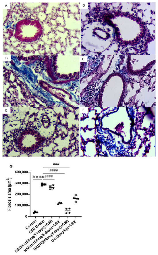 NADH protected against CSE-induced airway fibrosis. Representative lung tissue sections stained with Masson’s trichrome, taken at 400× magnification. Top panel: (A) control group, (B) CSE group, (C) NADH (200 mg/5 days) + CSE, (D) NADH (100 mg/5-day regimen) + CSE, (E) NADH (100 mg/11-day regimen) + CSE, (F) dexamethasone (2 mg/kg) + CSE, (G) assessment of collagen content. Bottom panel: comparison of extent of airway fibrosis (μm2) in lungs of different experimental groups compared to control group. **** p < 0.05 versus control group, ### p < 0.01 and #### p < 0.0001 versus CSE group, n = 4/per group.
