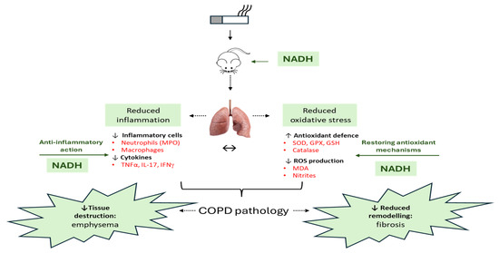 It is worth mentioning that these lung inflammatory changes coupled to emphysematous injuries were not observed in the NADH-treated groups (Figure 6C,E–J), further supporting the anti-inflammatory effect of NADH supplementation in this animal model of COPD.