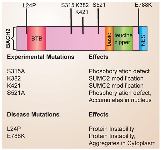 The structure of the BACH family of transcription factors has been reviewed in detail previously [15]. The BACH family consists of a basic region leucine zipper (bZip) containing transcription factors that form heterodimeric complexes with Maf proteins to repress gene expression (Figure 1). Maf proteins bind to palindromic DNA sequences termed Maf recognition elements (MAREs). BACH2 also contains an N-terminal BTB domain that mediates protein–protein interactions and a C-terminal nuclear export sequence (NES). Through experimental mutagenesis, the sites of post-translational modification have been identified, including serine phosphosites and lysine residues that undergo SUMO2 conjugation. Disease-associated mutations have been identified and linked to specific defects in BACH2 protein stability and function (Figure 1). In addition, single nucleotide polymorphisms (SNPs) that have been noted to affect protein stability have been identified. Associations with autoimmune diseases have been reported with BACH2 (See Table 1).