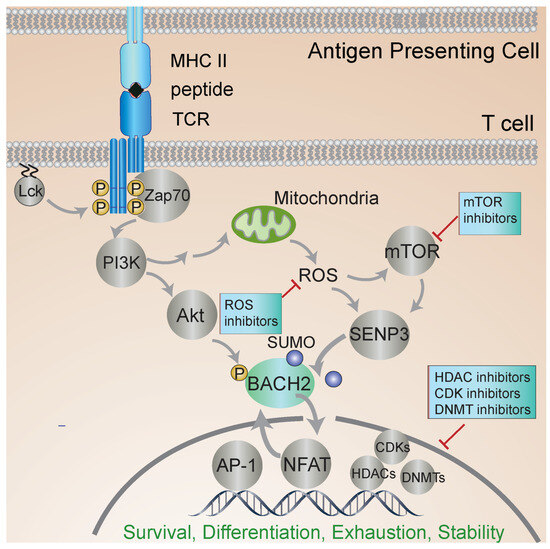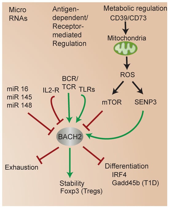 Several studies have shed light on new mechanisms of BACH2 regulation and the links between metabolism, BACH2, FOXP3, and iTreg stability [73]. Previous studies identified that the small ubiquitin modifier (SUMO) sentrin-specific protease SENP3 serves as a sensor of metabolic status, particularly intracellular ROS, which regulates the nuclear translocation of SUMOylated BACH2 [80,81], the association of SUMOylated BACH2 with promyelocytic leukemia nuclear bodies, and the repression of associated transcriptional targets [65] (Figure 2 and Figure 4). During T-cell activation, increased levels of intracellular ROS induce the accumulation of SENP3 in the nucleus. In turn, SENP3 induces the deSUMOylation of BACH2, which inhibits the nuclear export of BACH2. Accumulated nuclear BACH2 in turn modulates the expression of genes that regulate FOXP3 iTreg stability [82].