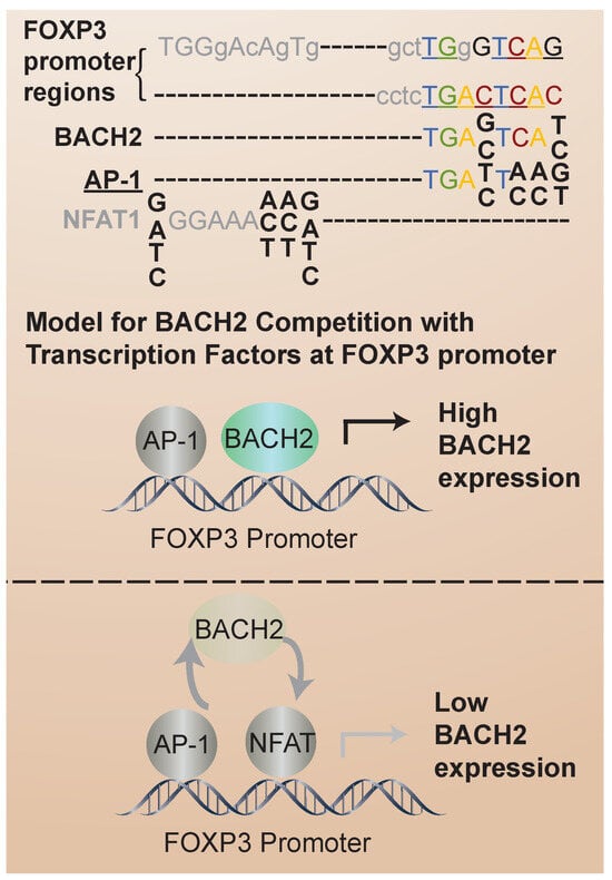 Recent insights into the mechanisms of BACH2-mediated transcriptional control of iTreg stability come from the analysis of transcription factor binding sites. Nuclear factor of activated T cells (NFAT) proteins are activated by calcium signaling pathways upon T-cell receptor (TCR) stimulation. Once activated, NFAT translocates into the nucleus, where it binds to specific DNA sequences, known as NFAT response elements, in the promoter regions of target genes [48]. FOXP3 expression and the iTreg suppressor phenotype depend on interactions with the NFAT transcription factor [49]. In FOXP3+ Treg cells, NFAT contributes to the expression of genes involved in Treg cell development and function, including FOXP3 itself. The BACH2 consensus binding sequence overlaps with that of NFAT (Figure 3). Thus, one intriguing possibility is that BACH2 competes with NFAT for the same binding sites in iTregs to regulate iTreg transcriptional stabilization. Also, FOXP3 interacts with BACH2 in a co-immunoprecipitation binding assay [47]. Because BACH2 expression is higher in UCB than AB iTregs, BACH2 regulation of FOXP3 and competition with NFAT could contribute to the differential stability of UCB and AB iTregs. In analogy to this proposed mechanism, it has been found that BACH2 modulates CD8 T-cell differentiation by regulating AP-1 binding to enhancer regions of TCR-regulated genes [3]. AP-1 is a dimeric transcription factor composed of proteins from the Jun (c-Jun, JunB, JunD) and Fos (c-Fos, FosB, Fra-1, Fra-2) families [50]. AP-1 activity is regulated by various signaling pathways, including those activated downstream of TCR engagement [51]. In addition, BACH2 represses the AP-1-driven expression of IL-2 in CD4 T cells [52]. Thus, it is of interest to determine whether an analogous mechanism of BACH2/NFAT competition is involved in the regulation of iTreg stability. In addition to competition for transcription factor binding sites, it has been identified that BACH2 can regulate NFAT expression. In particular, reduced BACH2 expression was correlated with aberrant NFAT expression in T cells derived from chronic myelogenous leukemia patients [53].