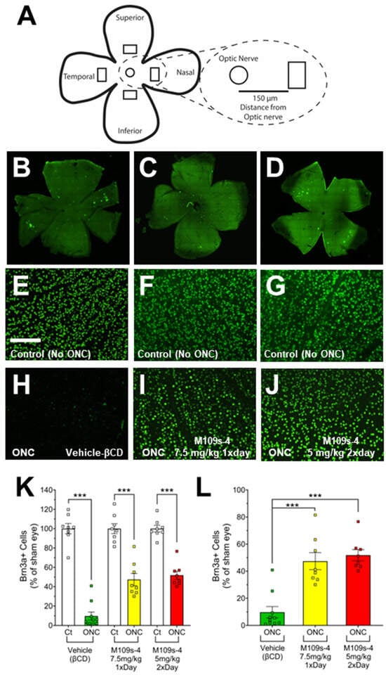M109S attenuated the decrease of BRN3A-positive (BRN3A+) RGCs in ONC-treated retina. ONC and M109S administration procedures were conducted according to the protocol outlined in Figure 1A. BRN3A+ cell counts were performed on retinas from both sham and ONC-treated eyes. (A) Schematic of whole retina flat mount showing an approximate location where images were taken. The circles denote the optic nerve, and the rectangles represent the location where images were taken. (B–D) Tiled images of a retina stained with anti-Brn3a and the Alexa-488 (green fluorescence)-conjugated secondary antibody; (E–G) Immunostaining of BRN3A in the retina from sham eyes; (H–J) Immunostaining of BRN3Ain the retina of the ONC-treated eyes. (B,E,H) Vehicle-treated control mice; (C,F,I) 7.5 mg/kg M109S once a day; (D,G,J) 5 mg/kg M109S twice a day (total 10 mg/kg per day). (K) The data are shown as the percentages of the number of BRN3A+ cell relative to sham eyes, with the average number of Brn3a+ cells in sham eyes designated as 100% for each treatment group. (L) The graph showed only the ONC-treated retina (The results of sham control are removed from K). ONC treatment induced a drastic decrease of BRN3A+ cells in vehicle control mice. On the other hand, mice treated with M109S at 7.5 mg/kg (once a day) or 5.0 mg/kg (twice a day) exhibited a substantial rescue in Brn3a+ RGCs. The data are presented as the percentage of BRN3A+ cell survival ± SEM for vehicle control (No-ONC (n = 8) and ONC (n = 10)), M109S 7.5 mg/kg (once a day) (n = 8), and M109S 5.0 mg/kg (twice a day) (n = 8). Statistical significance is denoted as *** p < 0.001. Scale bar = 150 μm.