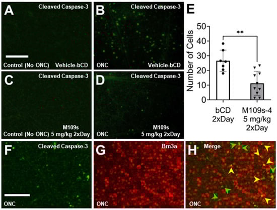 M109 treatment suppressed ONC-induced Caspase-3 activation in the retina. (A–D) The retina was stained with anti-cleaved Capase-3 (activated Caspase-3) and Alexa-488-conjugated secondary antibody. Caspase-3-positive cells were detected in the retina collected on Day 3 after ONC (B,D) but not in the control retina (A,C). In the ONC-treated eyes, M109S treatment (5 mg/kg M109S twice a day decreased the number of active-Caspase-3-positive cells in the retina of the ONC-treated eyes (B). To be noted, the staining of active Caspase-3 was detected in the cell body in the retina. (E) The quantitative analysis shows that the effects of M109S to decrease the number of active Caspase-3-positive cells were statistically significant (p = 0.0012). Circles and triangles denote individual retinas treated with Vehicle and M109S (administered at 5 mg/kg twice daily), respectively. (F,G) The retina collected 3 days after ONC was stained with antibodies detecting cleaved (activated) Caspase-3 (green) and Brn3a (red). (H) Merged image of F and G detecting cleaved (activated) Caspase-3 (green) and Brn3a (red). There are cells expressing active Caspase-3 (green arrows) and cells expressing both active Capase-3 and BRN3A (yellow arrows) indicating that some of the BRN3A+ RGCs undergo apoptosis within 3 days after ONC. The data are presented as the number of Caspase-3-positive cells ± SEM for vehicle control (n = 7), and M109S 5.0 mg/kg (twice a day) (n = 10). A total of four images were averaged for each retina to ensure representative data collection. Statistical significance is denoted as ** p < 0.01. Scale Bar = 150 μm.