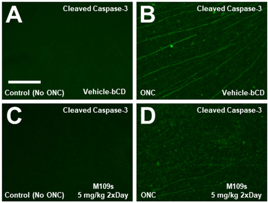 To determine the effects of M109S on apoptosis induction, the retina was stained with anti-active Caspase-3 (cleaved Caspase-3). On Day 3, after ONC, active Caspase-3 was detected in the cell bodies of ONC-treated retinas, whereas almost no active Caspase-3 was detected in the sham control (Figure 3A,C). The number of cells with active Capase-3 was counted in each retina, and the effects of M109S on the appearance of active Caspase-3-positive cells were assessed. As shown in Figure 3D,E, M109S treatment (5 mg/kg twice a day) inhibited the occurrence of Caspase-3 activation (t(15) = 3.99, p = 0.0012). Since the number of BRN3A+ RGCs decreased by ONC, we examined whether we could capture BRN3A+ RGC undergoing apoptosis by the double staining for BRN3A and cleaved (active) Caspase-3. As shown in Figure 3F–H, some of the Brn3a+ RGCs were double stained with anti-active Caspase-3 (these cells are indicated by yellow arrows in Figure 3H), indicating that some of BRN3A+ RGCs undergo apoptosis within 3 days after ONC. BRN3A is known to be expressed in the nucleus [15], however, Caspase-3 is known to be activated in the cytosol, and the activated Caspase-3 distribute to the nucleus at a later stage of apoptosis [10,16]. Therefore, some of the BRN3A+ (nuclear staining) cells that have close staining of active Caspase-3 (it may be the cytosolic Caspase-3 staining) may be also undergoing apoptosis (these cells are indicated with green arrows in Figure 3H). We also stained the retinas collected on Day 7 after ONC treatment. Interestingly, active Caspase-3 was detected in the axon rather than the cell body of the retina collected at Day 7 (Figure 4). Since active Caspase-3 staining was detected mainly in the axon of the retinas collected on Day 7, it was not possible to count the number of active Caspase-3-positive cells to determine the effects of M109S on this day. Therefore, we determined the effects of M109S on Caspase-3 activation using the retina collected on Day 3 as explained above (Figure 3).