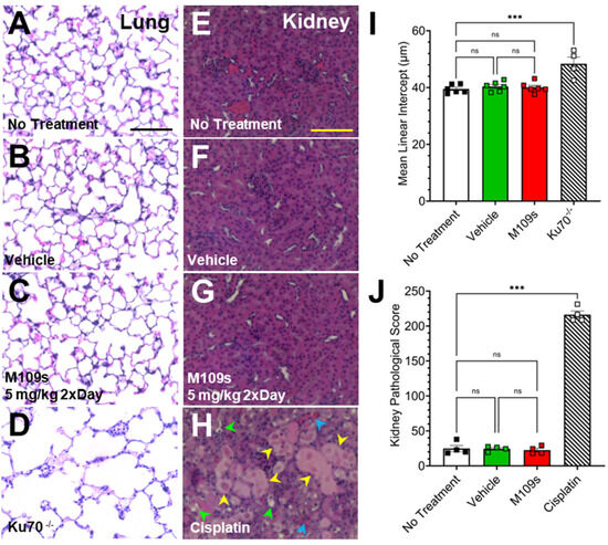 The lung alveolar size was quantitatively analyzed by a previously established method of calculating the mean linear intercept, an indicator of alveolar size [19]. One-way ANOVA showed a significant difference of mean linear intercept values between Ku70 KO lung tissue and all other treatment groups (F(3, 18) = 13, p < 0.001) (Figure 5I). Post hoc analysis (Tukey post hoc test) indicated significant damage in the Ku70 KO lung tissue compared to no treatment, vehicle-treated, and M109S-treated mouse lung tissue (Figure 5I). There were no statistically significant differences among no treatment, vehicle-, and M109S-treated groups, suggesting that M109S did not cause lung tissue damage (Figure 5A–D,I).