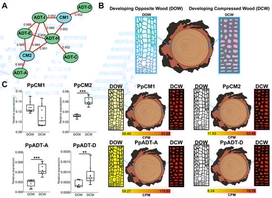 The existence of two CM isoforms in pine, as observed in other gymnosperms, suggests the existence of alternative and likely non-overlapping physiological roles. Our expression analyzes show that in pine seedlings, the two isoforms present markedly different expression patterns. PpCM1 expression is preferential in cotyledon mesophyll cells, hypocotyl pith, and in the vascular tissues of developing roots, while PpCM2 is preferentially expressed in vascular tissues from young needles, vascular cells of cotyledons, and hypocotyls. We also analyzed the expression of PpCM1 and PpCM2 in the highly lignified compression wood (CW) versus opposite wood (OW), which is characterized by lower levels of this polymer. Although the level of expression of both isoforms in CW is similar, the induction of PpCM2, compared to OW, (5.2x) is much higher than in PpCM1 (1.4X). The induction of PpCM2 could be associated with a higher rate of Phe synthesis to support the massive synthesis of lignin, distinctive of CW, but also of the vascular tissues of seedlings. Supporting this hypothesis, PpCM2 is more resistant to Phe inhibition than PpCM1, and retains considerable activity at high levels of Phe (30–35% at 2 mM), enabling this enzyme to generate a higher rate of Phe synthesis for lignification, consistent with the presence of two Phe-insensitive type ADTs, such as PpADT-A and PpADT-D [