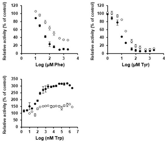 CM reactions consisted of a final volume of 80 µL containing 50 mM Tris buffer pH 8, varying concentrations of chorismate, and 0.3 µg of the corresponding purified CM enzyme. CM assays were conducted in a plate reader at 30 °C, using UV-transparent 96-well plates (UV-Star®, Greiner Bio-One. GmbH, Frickenhausen, Germany), by tracking the disappearance of chorismate, which results in an absorbance decrease at A274 nm (ε = 2630 M−1 cm−1). Chorismate (C1259) was obtained from Merck KGaA (Darmstadt, Germany) To identify putative amino acid effectors, the reactions were conducted as described above; containing 50 mM Tris buffer pH 8, 1 mM chorismite, 0.3 µg of the CM enzyme, individually supplemented with 2 mM of each amino acid. Assays showing a minimum 1.5-fold increase or reduction compared to controls were selected for further analysis. Similarly, the effect on CM activity of decreasing concentrations of the amino acids Phe, Tyr, and Trp was determined.