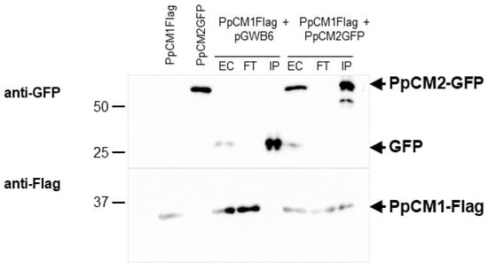 DNA sequences coding for both PpCM1 and PpCM2 were subcloned into the pGWB11 (C-terminal FLAG tag) and pGWB5 (C-terminal GFP tag) vectors, respectively, using Gateway technology. PpCM2-GFP and PpCM1-FLAG proteins were expressed through agroinfiltration in