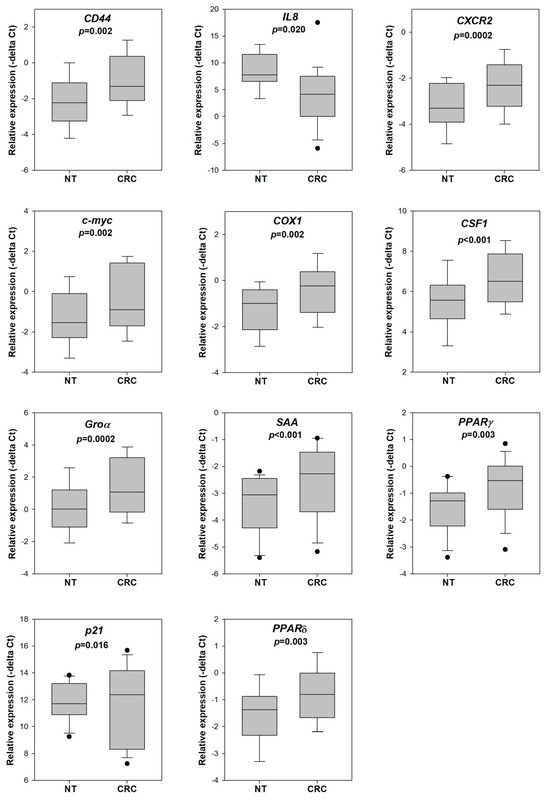 Gene expression in tumor and adjacent non-tumor tissue of CRC patients. The expression of CXCR2, SAA, COX1, PPARδ, PPARγ, Groγ, IL8, p21, c-myc, CD44 and CSF1 was significantly higher in the tumor tissue (CRC) when compared to the adjacent non-tumor tissue (NT) of CRC patients (n = 21). The relative expression of each gene was calculated by delta Ct (target gene-actin), and the p-value was determined by a paired t-test.
