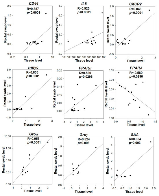 Correlation of gene expressions between rectal swab and tissue specimens. The gene expression of CD44, IL8, CXCR2, c-myc, PPARα, PPARδ, Groα, Groγ and SAA in the tissue was significantly correlated with that in the paired rectal swab of CRC patients (N = 21). The gene level in the tissue was expressed as a fold change of its level in tumor to non-tumor, whereas the gene level in the rectal swab was expressed as a fold to actin. The correlation coefficient (R) and p-value were analyzed by Pearson correlation.