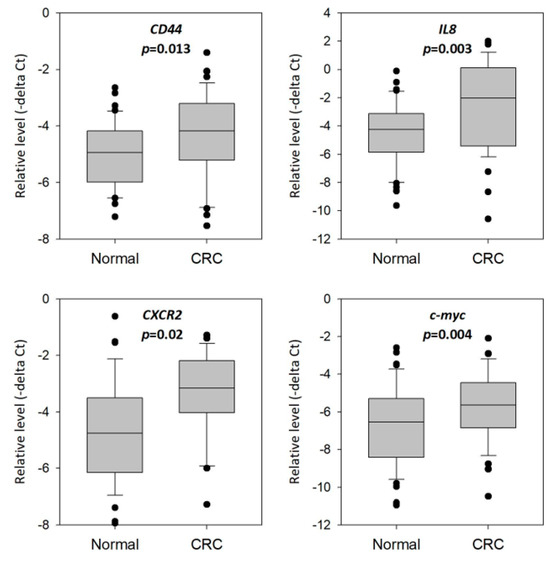 We compared the expression of the 14 genes in rectal swab specimens between normal and CRC patients in the training set consisting of 39 normal subjects and 37 CRC patients. CD44, IL8, CXCR2 and c-myc were significantly overexpressed in CRC patients when compared with normal subjects (Figure 3). The fold changes of these genes in CRC patients compared to those of normal subjects were as follows: CD44 (1.84-fold; p = 0.013); IL8 (3.69-fold; p = 0.003); CXCR2 (2.71-fold; p = 0.002) and c-myc (1.96-fold; p = 0.004). Hence, we chose these four genes for downstream analyses on their potential as diagnostic biomarkers for CRC.