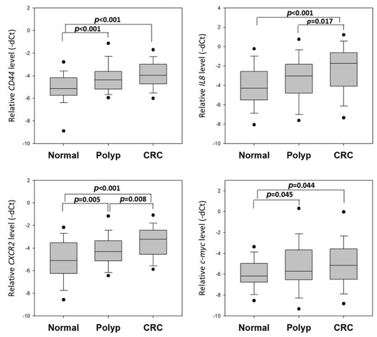 We then performed a training study to compare the levels of these 14 genes in rectal swab specimens collected from healthy control and CRC patients. CD44, IL8, CXCR2 and c-myc were consistently overexpressed in CRC patients; hence, we further investigated their levels among healthy control, polyp and CRC patients and evaluated their potential as screening biomarkers in the validation study. In line with the results in the training set, all four genes showed significantly higher levels in CRC patients when compared to normal subjects. The levels of these genes were also found to show significant differences between normal and polyp subjects and/or polyp and CRC subjects, confirming their dysregulation during the transformation of colorectal epithelium to polyp and, subsequently, to cancer.